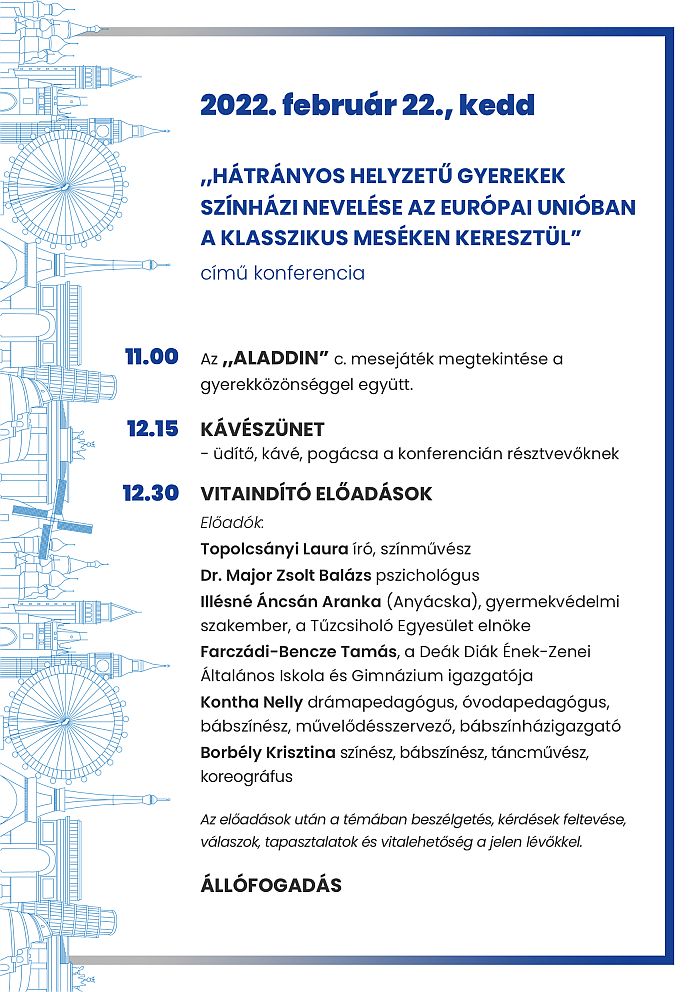 A konferenciára hangoló színházi előadás ez alkalommal az Aladdin című mesejáték volt, a Turay Ida Színház művészeinek tolmácsolásban. A sok mesejáték közül azért esett erre a választás, mert a főhős, Aladdin is egy sok tekintetben hátrányos helyzetű fiú. Története az Ezeregyéjszaka meséiből való, de sorsának hordozói ma is jelen vannak közöttünk, akkor is, ha a modern társadalom igyekszik felkarolni, legalábbis az alapvető igényeiket, – mint lakhatás, iskoláztatás – kielégíteni. De a további természetes vágyak – mint egzisztenciális és szellemi jólét – ma is nehezen elérhetőek. Az előadás gondolatébresztőként szolgált annak körbejárására, hogy a színház hogyan tud a maga eszközeivel reményt adni egy olyan életút felmutatásával, amelyben a megbélyegezettség és kirekesztettség a domináns érzés, és amelyből mégis van kiút, ez pedig a megkérdőjelezhetetlen hitből táplálkozik. Ennek a hitnek az alapja a determináltság elutasítása, az eleve elrendeltség helyett a saját egyéni út szabad megkeresése, végigjárása. Az eltökéltség, hogy a minőségi életmindenkinek jár. Olyan előadókat hívtunk meg, akik nemcsak elméleti megközelítésből ismerik a témát, hanem saját gyakorlati tapasztalatuk van a szociális szférából. A konferencia háziasszonyaként Szőnyi Kinga, a Klasszikus Színházért Alapítvány kuratóriumi tagja, a Magyar Asszonyok Érdekszövetségének alapító elnöke konferálta fel a művészi és szakmai előadókat.